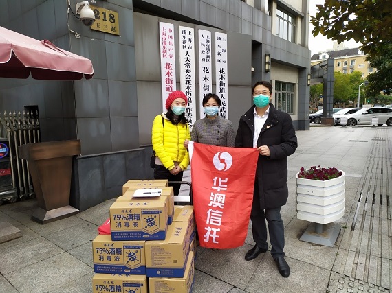 1月26日,中國信托業(yè)協(xié)會成立“中國信托業(yè)抗擊新型肺炎慈善信托”的倡議發(fā)布后,華澳信托在吳瑞忠董事長的領(lǐng)導(dǎo)下,迅速響應(yīng)號召,投入慈善專項資金50萬元,助力打贏新型冠狀病毒肺炎疫情防控阻擊戰(zhàn)。2月14日下午,華澳信托在吳瑞忠董事長的領(lǐng)導(dǎo)下,由工會向企業(yè)所在地上海浦東新區(qū)捐贈了2160瓶75%酒精消毒液,其中,600瓶捐贈至陸家嘴金融貿(mào)易區(qū)綜合委員會、總工會,其余1560瓶分別捐贈給洋涇街道辦事處、濰坊新村街道辦事處、塘橋街道辦事處、陸家嘴街道辦事處和花木街道辦事處,向奮戰(zhàn)在抗擊疫情一線的工作人員提供物資支持。